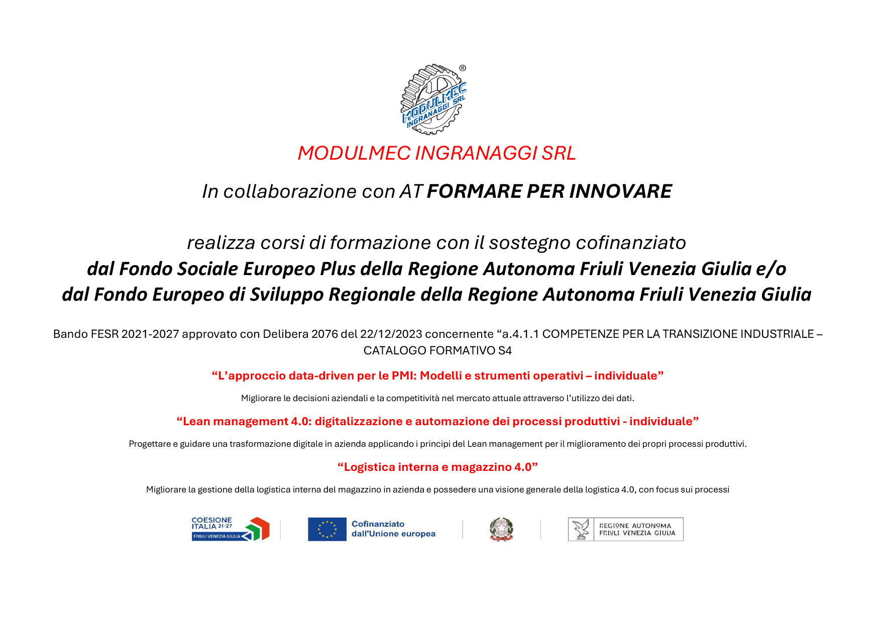 Modulmec Ingranaggi s.r.l., in collaborazione con AT FORMARE PER INNOVARE, realizza corsi di formazione con il sostegno cofinanziato dal Fondo Sociale Europeo Plus della Regione Autonoma Friuli Venezia